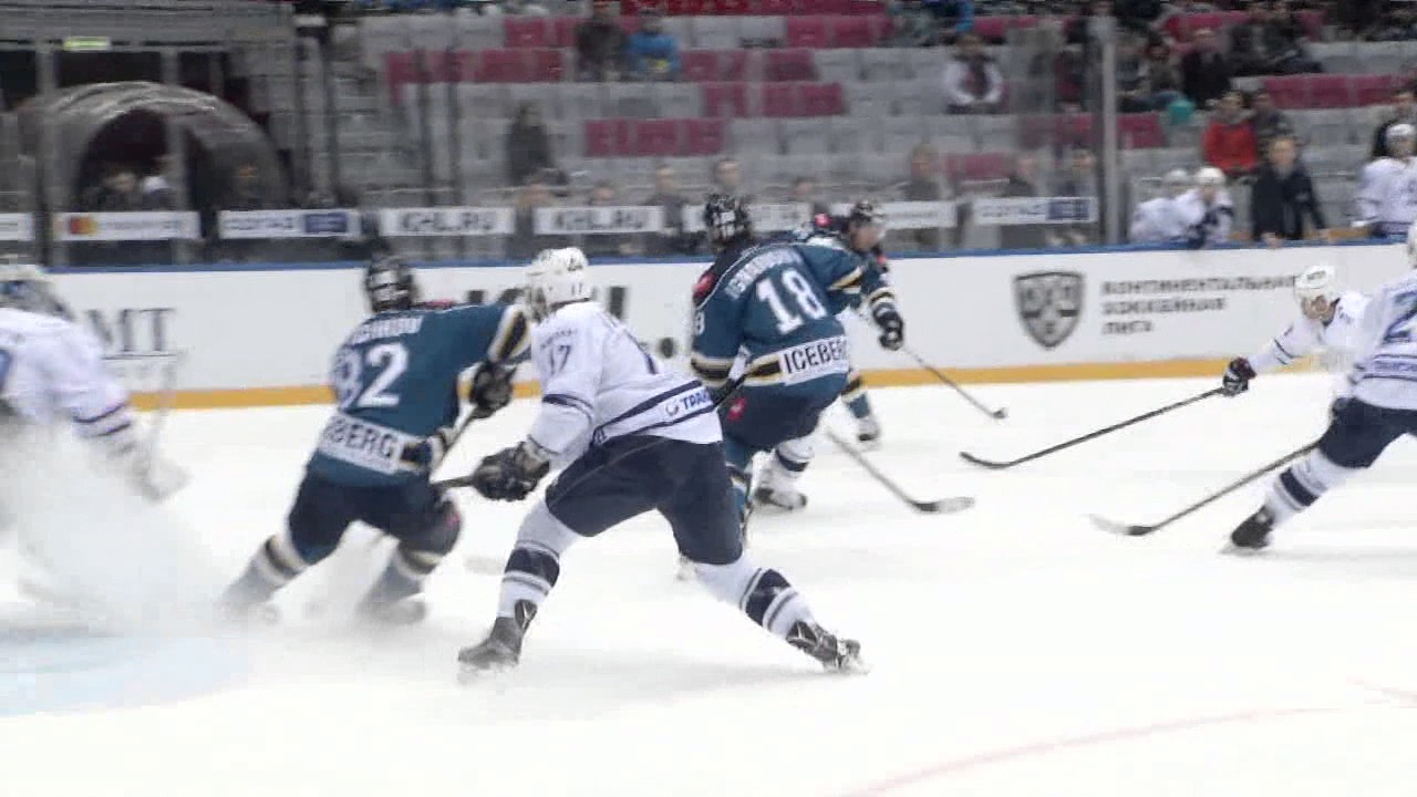 HC Sochi Andre Petersson blasts the onetimer past Dynamo's Alexander Lazushin in the PP to make his team lead two-nothing early int eh 1st period