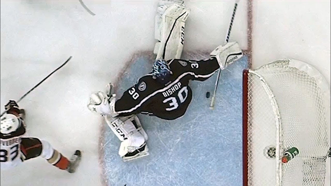 Tampa Bay Lightning goalie Ben Bishop uses the butt end of his stick to make a wild save on Anaheim Ducks forward Ryan Kesler.