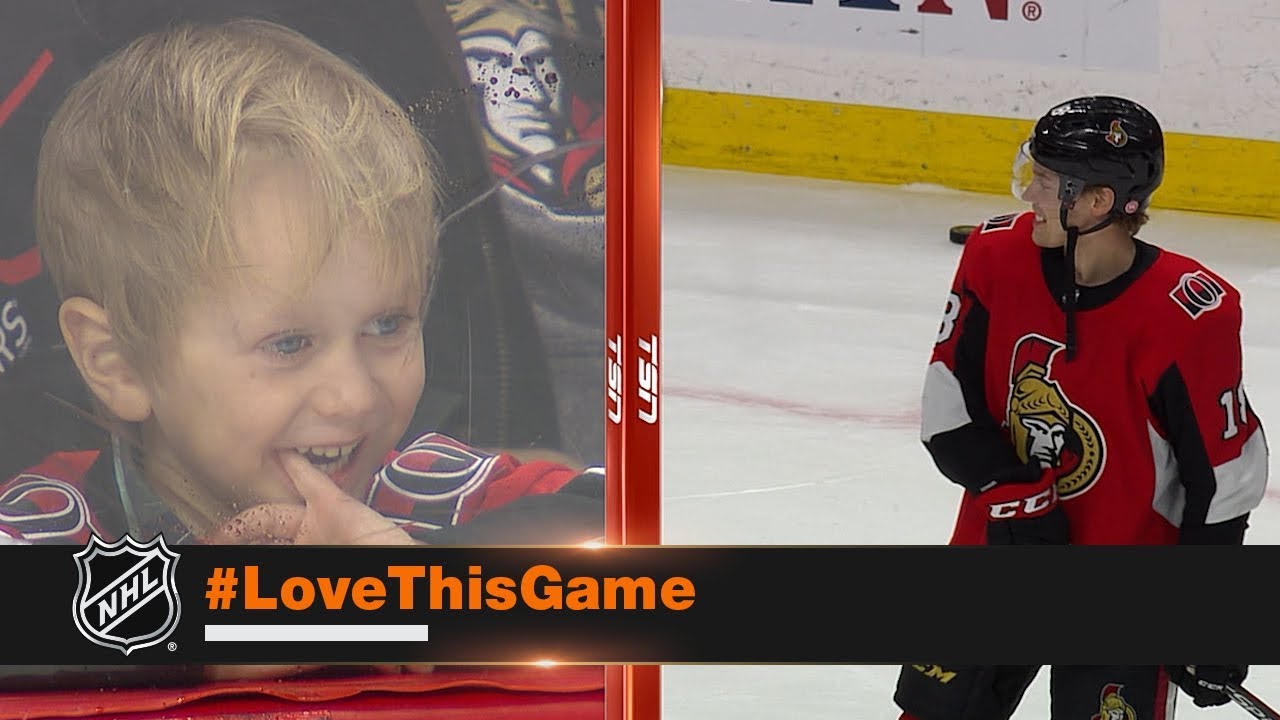 Senators forward Ryan Dzingel playfully whips a wrister off the glass right in front of a young fan, who has a laugh with the Ottawa star after the quick scare