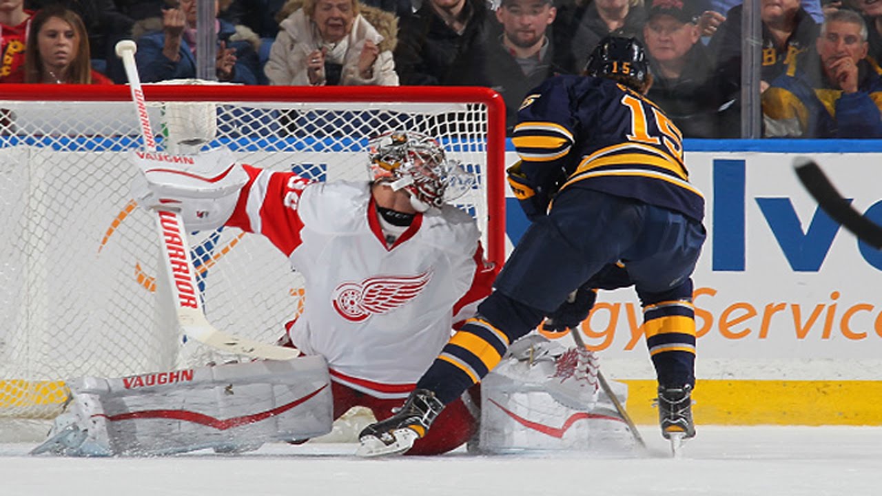 Buffalo Sabres forward Jack Eichel uses a quick deke to tuck the puck around the pad of Red Wings goalie Petr Mrazek on the breakaway to tie the game at 2-2.