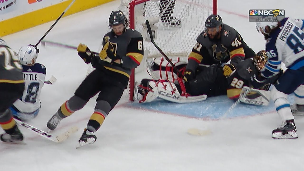 As Bryan Little's breakaway attempt caroms off the end boards, Marc-Andre Fleury remarkably sprawls to shut down Mathieu Perreault's follow-up bid, keeping the Golden Knights ahead by two in Game 3