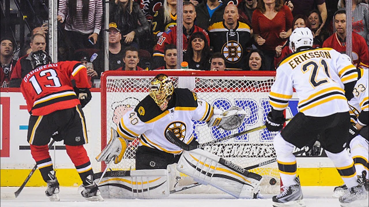 Calgary Flames defenseman Dougie Hamilton drops the puck back to Johnny Gaudreau who fires the OT winner under the pad of Bruins goalie Tuukka Rask.