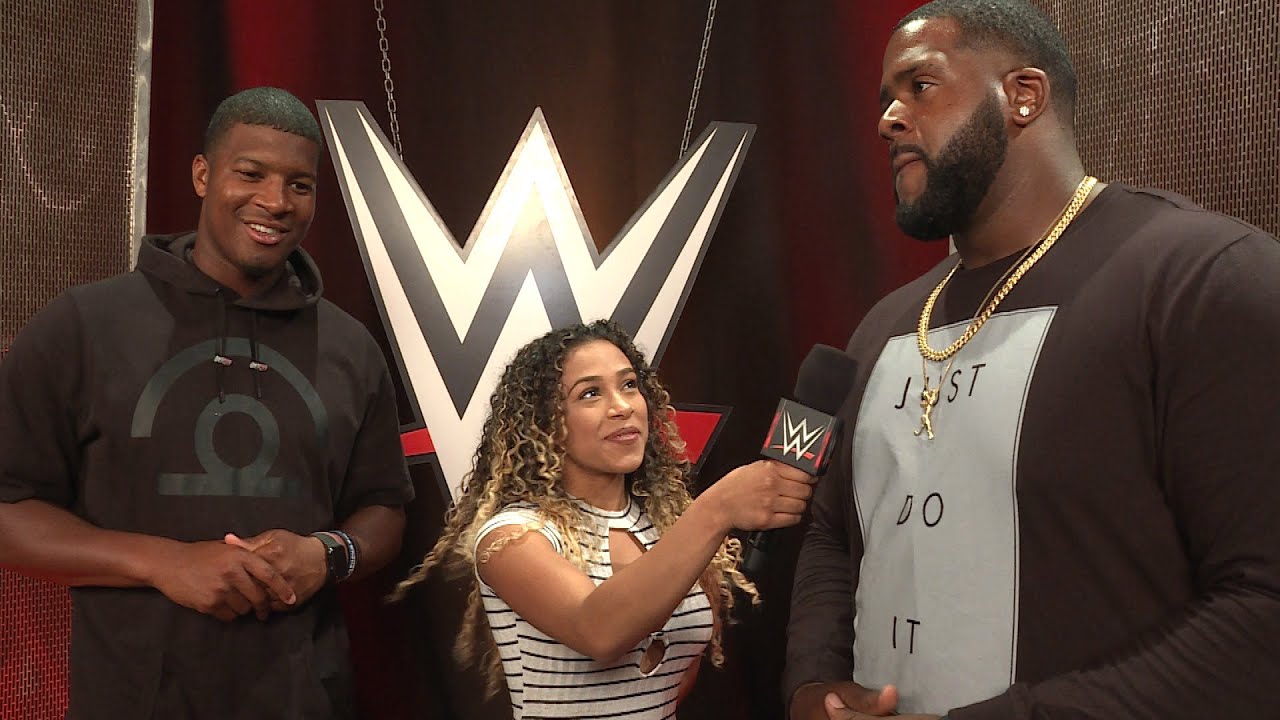 Jameis Winston and Donovan Smith of the Tampa Bay Buccaneers get ready for Monday Night Raw backstage.