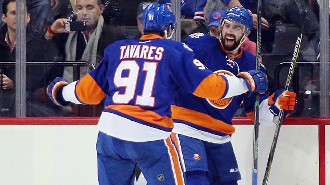 New York Islanders defenseman Nick Leddy gets the puck from John Tavares and snaps a qucik shot past Rangers goalie Henrik Lundqvist for the game-winning goal.