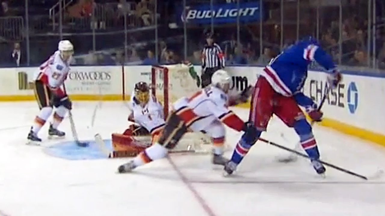 New York Rangers forward Kevin Hayes sends a beautiful no-look behind the back pass to Oscar Lindberg, who beats Flames goalie Jonas Hiller to tie the game.