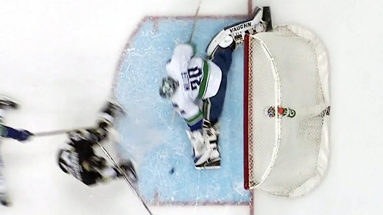 Vancouver Canucks goaltender Ryan Miller goes post-to-post and kicks out the right pad to stone Penguins forward Patric Hornqvist from point-blank range.
