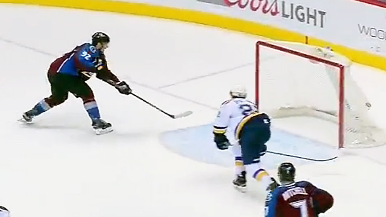 Avalanche forward John Mitchell races down a pass and eludes charging Blues goaltender Jake Allen to set up Gabriel Landeskog for the game-winner in overtime.