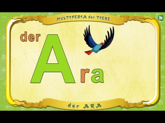 Buchstaben und Wörter lernen zusammen mit Tante Eules Multipedia. Kennenlernen des Buchstaben A und des Wortes Ara. Animiertes Tieralphabet in Deutsch.