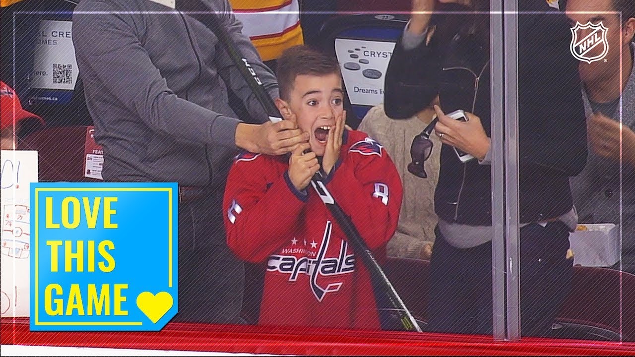 Capitals legend Alex Ovechkin tosses his stick to a young fan, who is equal parts shocked and overjoyed at his new gift