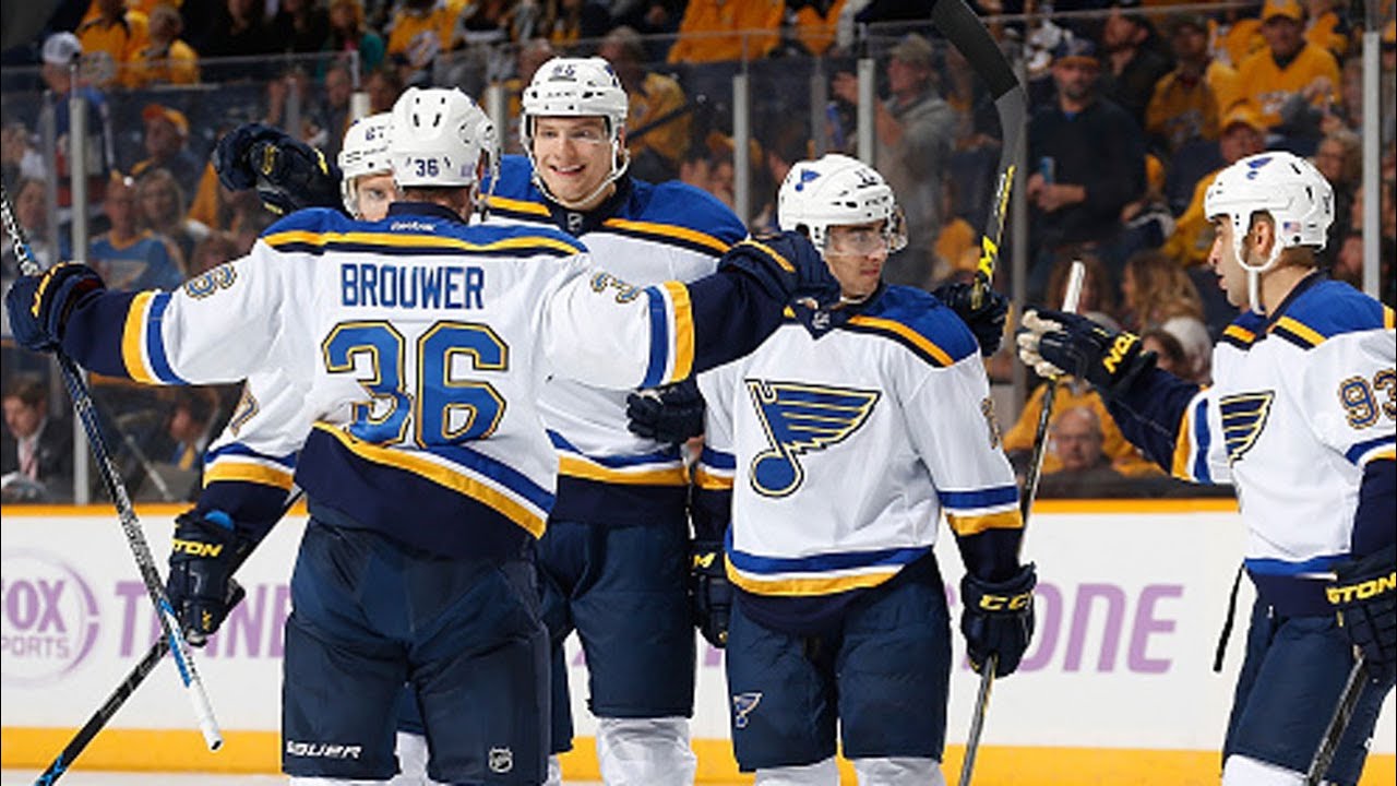 St. Louis Blues defenseman Colton Parayko puts the finishing touch on a nice power-play setup against Predators goalie Pekka Rinne.