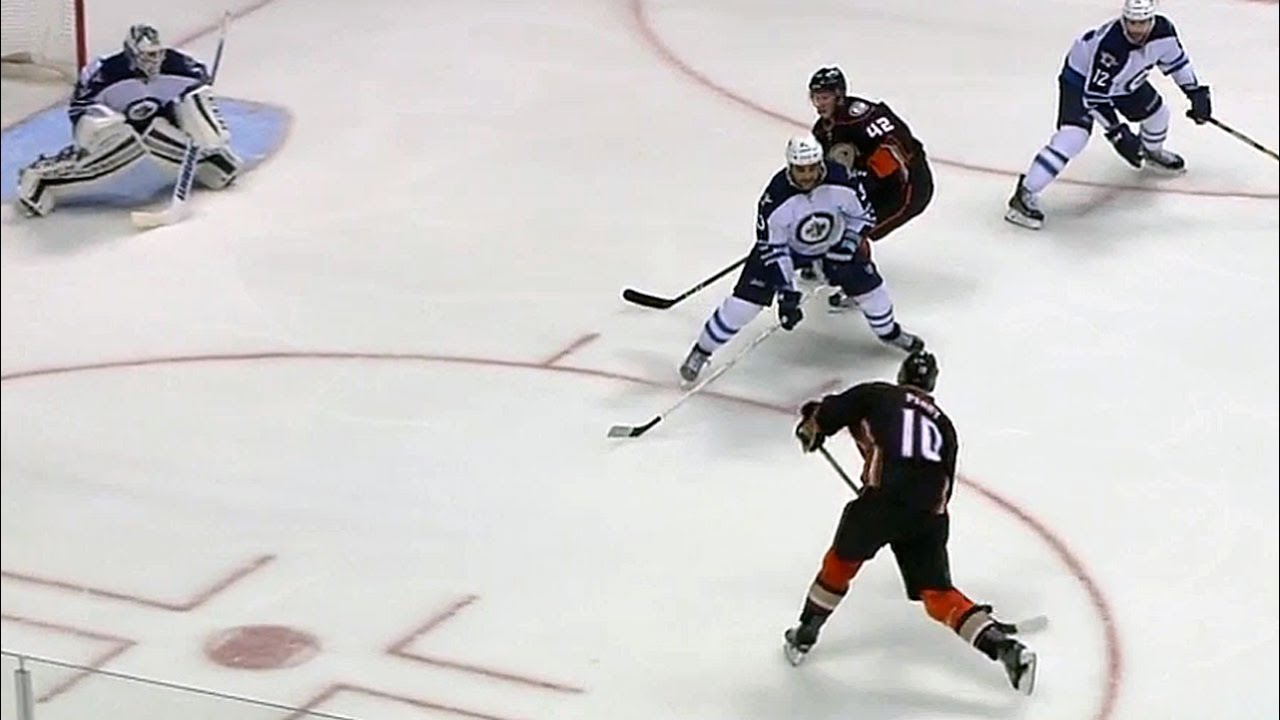 Anaheim Ducks forward Corey Perry brings the puck into the circle and snipes the puck past the blocker of Winnipeg Jets goalie Michael Hutchinson.