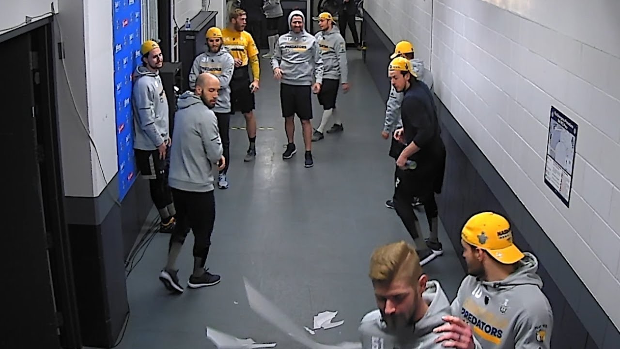 The Nashville Predators enjoy a pregame soccer routine in the hallway that results in a pair of broken light fixtures before Game 4 at Bell MTS Place in the Second Round of the 2018 Stanley Cup Playoffs