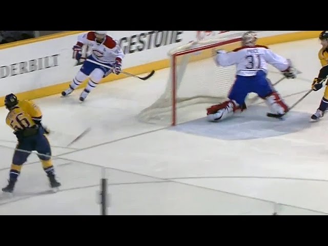 Canadiens goalie Carey Price gets turned around and is forced to make a fantastic backwards skate save robbing Predators forward Kevin Fiala of a sure goal.