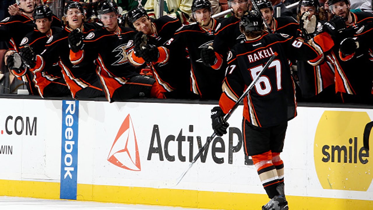 Anaheim Ducks forward Rickard Rakell picks up the puck off his skate then chips a backhander past Flames goalie Karri Ramo to tie the game in the 1st period.