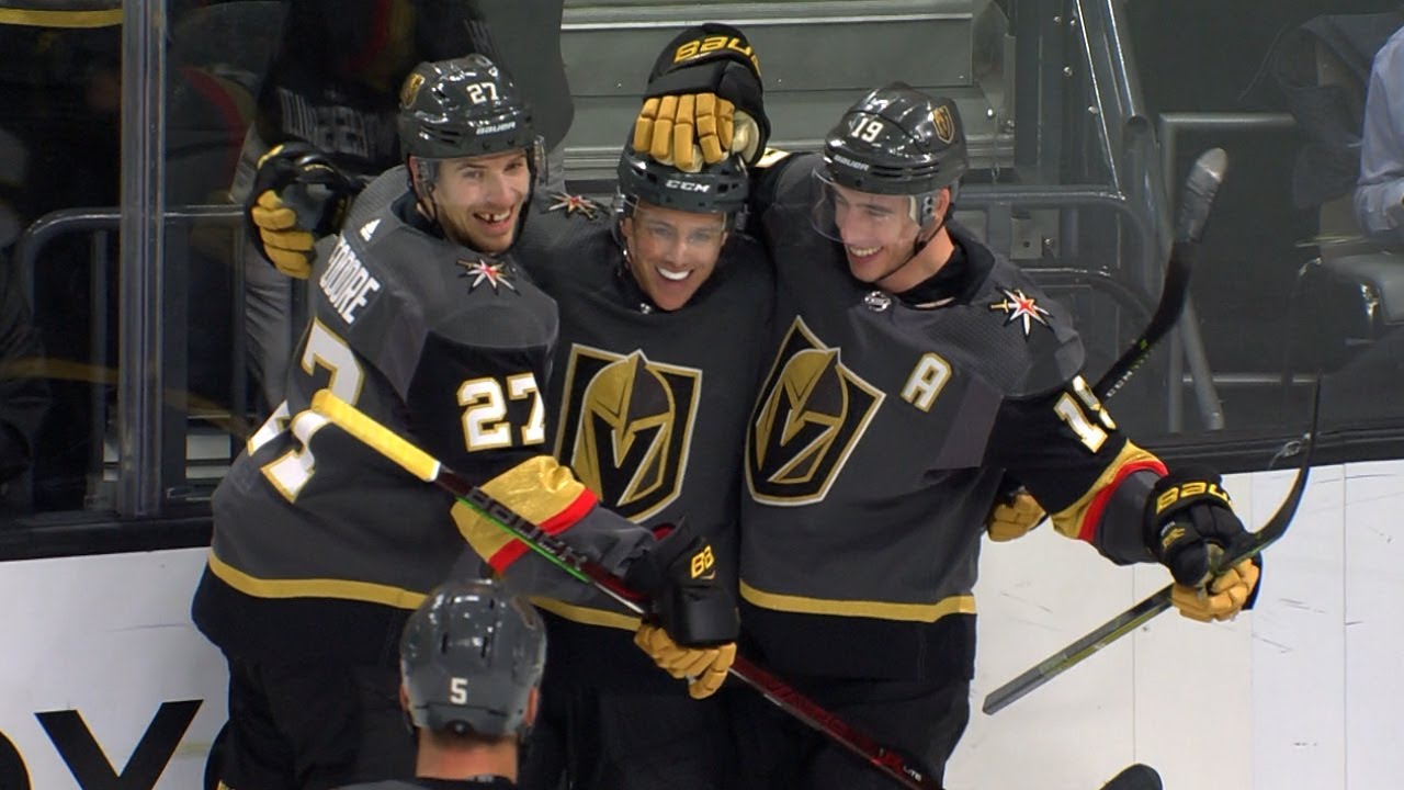 Vegas Golden Knights forward Reilly Smith smartly chips the puck over Corey Crawford's pad and buries the first goal of the game, then sends a spinning pass near mid-ice to Jonathan Marchessault to set up the game-tying goal against the Chicago Blackhawks