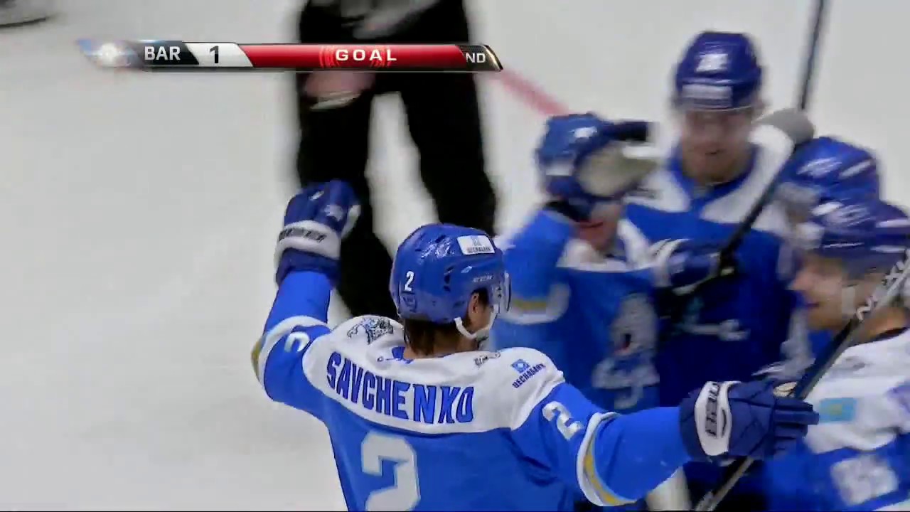 Barys Astana defenseman Roman Savchenko rips a slap shot from the blue line that beats Medvescak Zagreb goalie Drew MacIntyre for the goal.