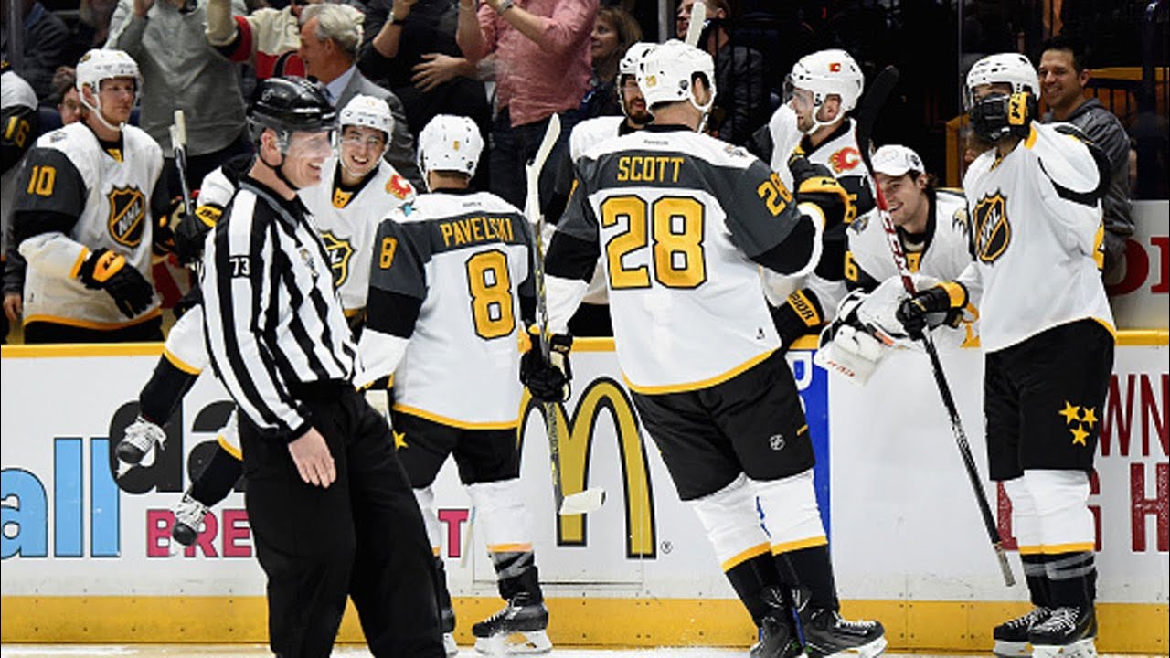Team Pacific captain John Scott speeds in on a breakaway and lights the lamp on Team Central goalie Devan Dubnyk for his second goal of the game.