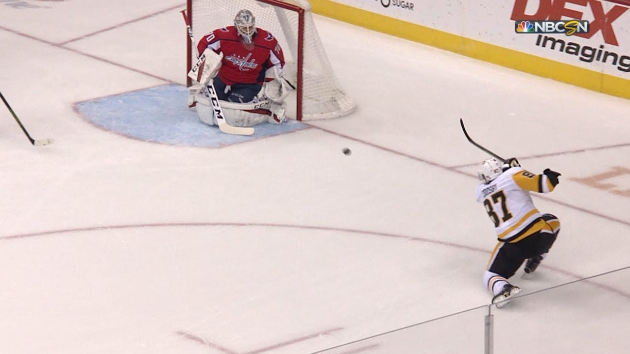 Pittsburgh Penguins captain Sidney Crosby receives a great feed from Jack Johnson after a turnover and rips a one-timer short side on Braden Holtby, opening the scoring in Washington, D.C.