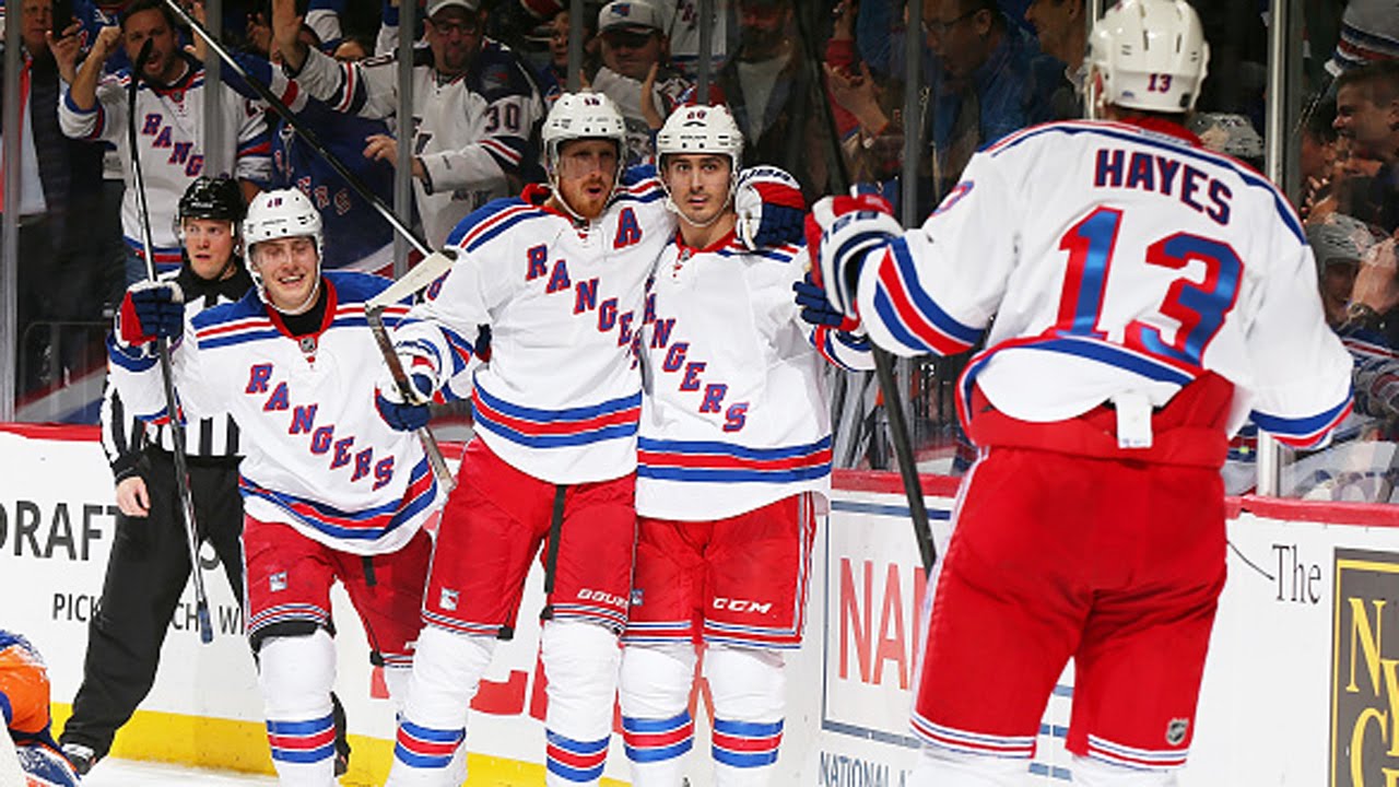 New York Rangers forward Kevin Hayes sends sends a beautiful spinning pass to Marc Staal in front, who tips it past Islanders goalie Jaroslav Halak.