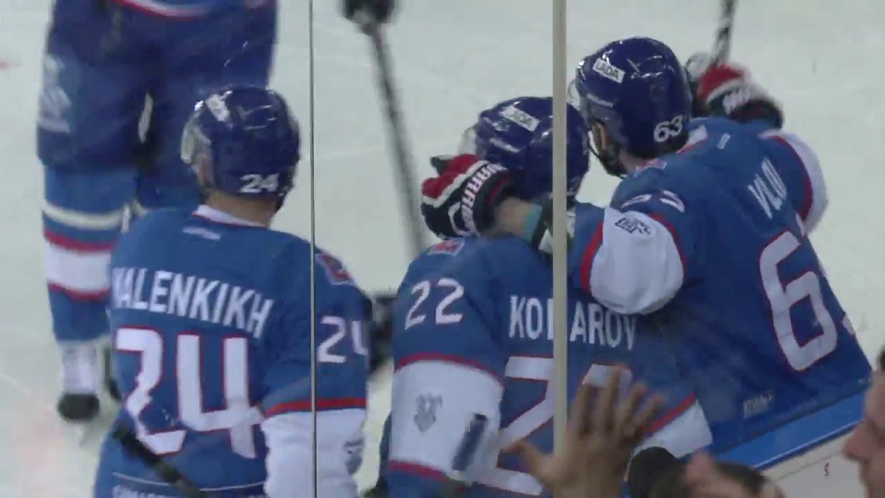 Lada forward Viktor Komarov adds the puck to the net from mid-air after Nikita Fialtov shot