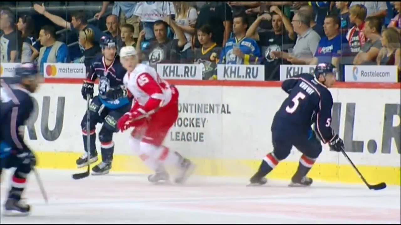 Spartak defenceman Vladislav Provolnev lays huge hit on Medvescak Alexandre Giroux knocking him to the ground